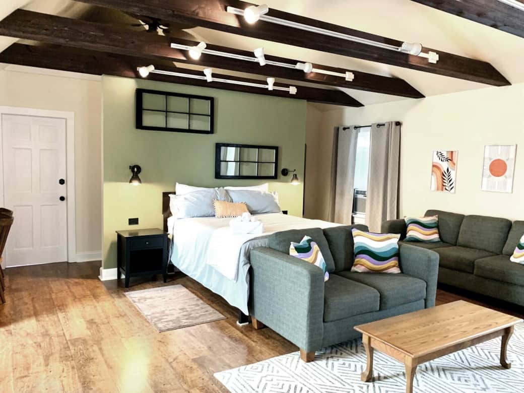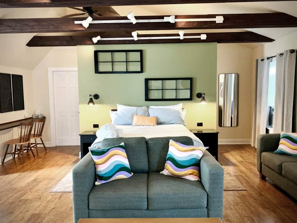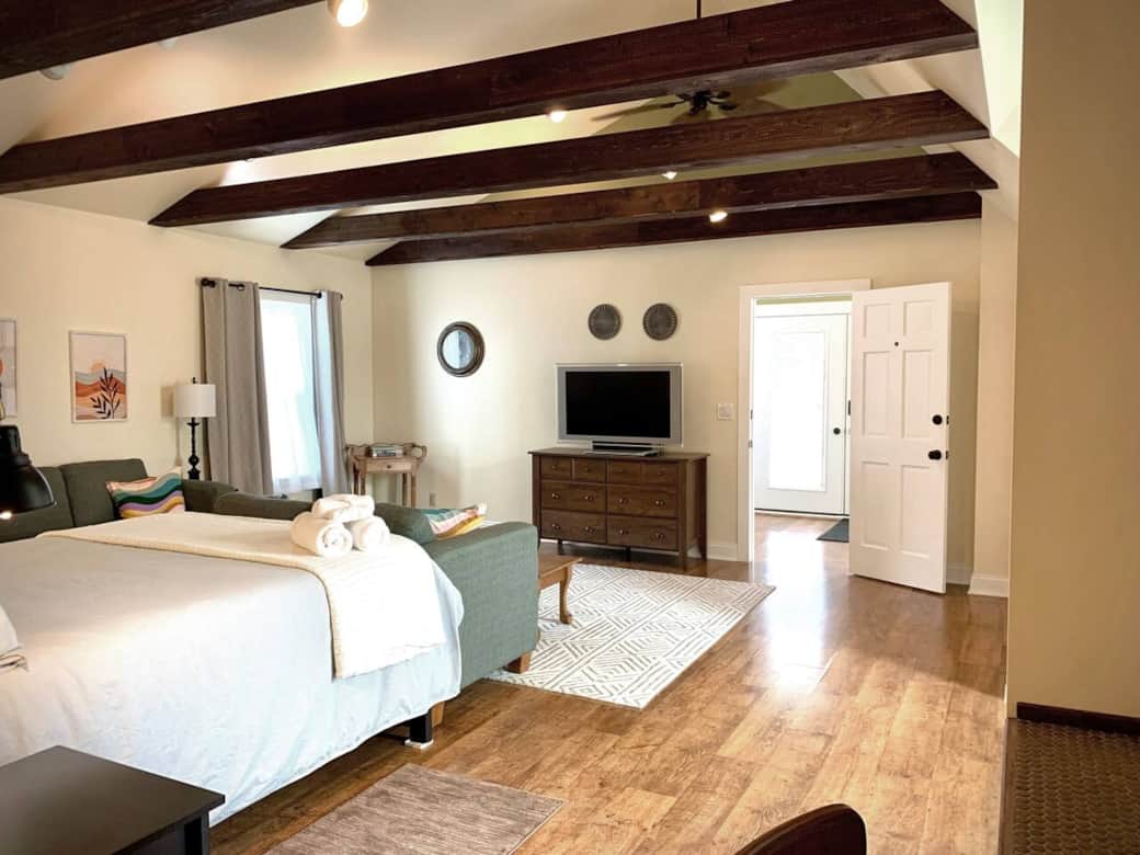 This large upstairs apartment features beautiful vaulted ceilings, a comfortable queen-sized bed, sofa, loveseat, TV, table, and chairs, as well as a full bathroom and workspace. Two roll-away beds, pack n play and high chair are available upon request for families with children.